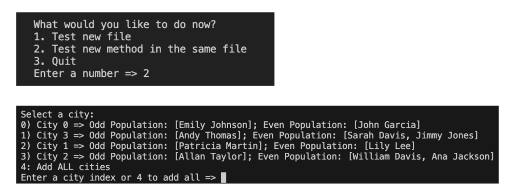 When testing this method, the Driver will allow you to pick from the Cities in the Cities ArrayList or insert all Cities in the order they appeared in setupGladiators. Changes from previous actions will be reflected when testing individual methods.