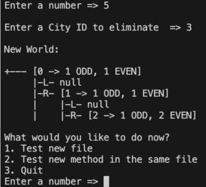 - If either the winner or loser city’s odd or even population sizes are 0, call eliminateCity on the City ID to remove that City from the BST.