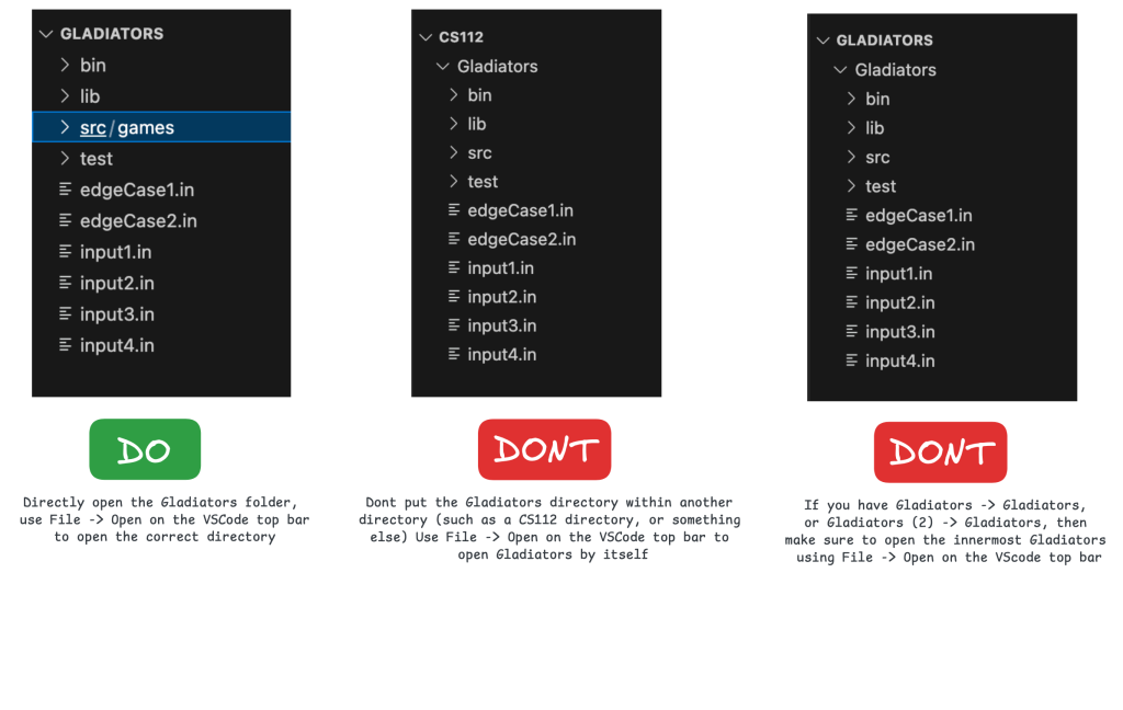 Afterward, open the Gladiators folder in VS Code using File -> Open Folder. Open the Gladiators folder that directly contains the bin, src, and lib folders. If you have a Gladiators folder inside Gladiators, or you have CS112 Code -> Gladiators, you must open the innermost Gladiators folder.