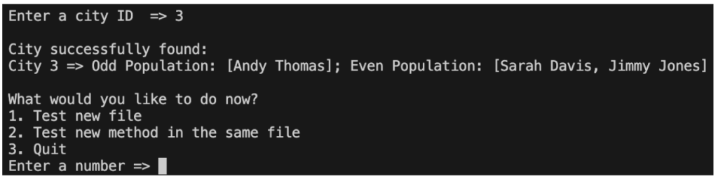 People are populated into cities and put into odd and even populations within each city. Cities are defined by an ID value and all cities can be stored through a binary search tree using IDs as key values for comparisons. Odd and even populations are based on whether each person’s birth month is odd or even. For example, January (01) birth months would be odd, while December (12) birth months would be even.