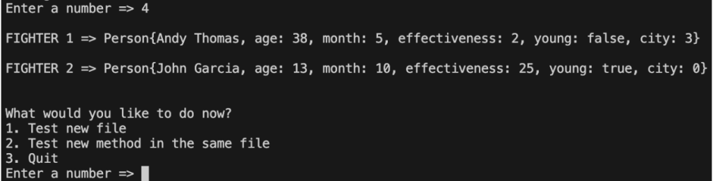 To test this method, select the setupGladiators option in the driver after also completing setupPeople – see above.