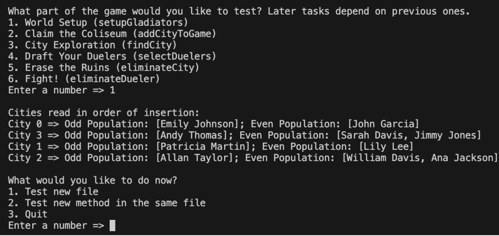 Then, select 1 to call setupGladiators (calls setupCities and setupPeople). This is the expected output using input1.in: