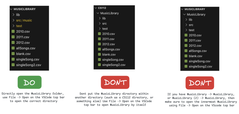 - Make sure you open the MusicLibrary folder directly, or else there may be issues with running the driver and/or reading the input files.