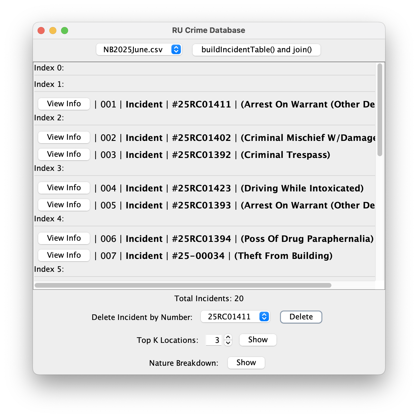To test this method, boot up the Driver. Select buildIncidentTable() with NB2025June.csv. Then scroll down to the bottom of the database, and compare: