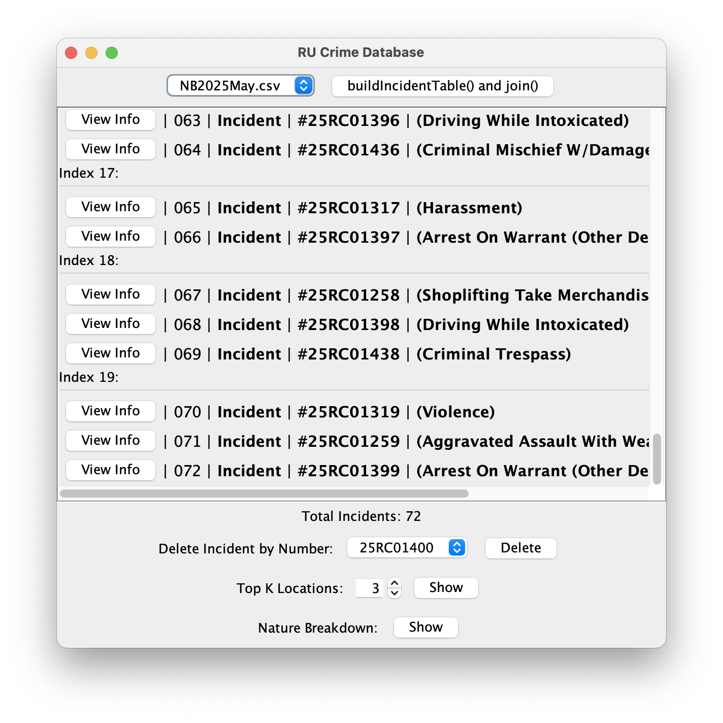 To test this method, first buildIncidentTable() with NB2025May.csv. Then, view and compare the top 5 locations using the info panel.