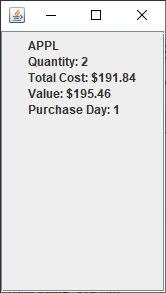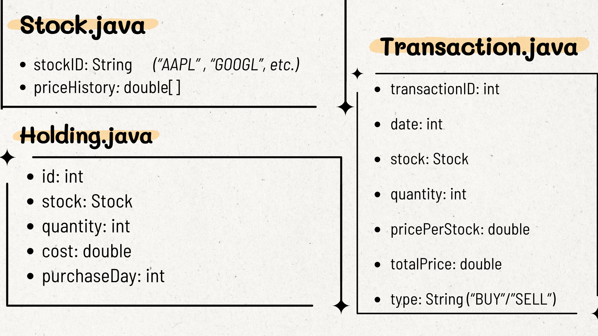 Holding.java is the investors share in a company’s stock. It contains attributes for quantity, the holding ID, the cost of the holding, and purchase day. Note that one investor can hold multiple different holdings of the same company, at different prices/purchase times.