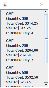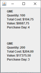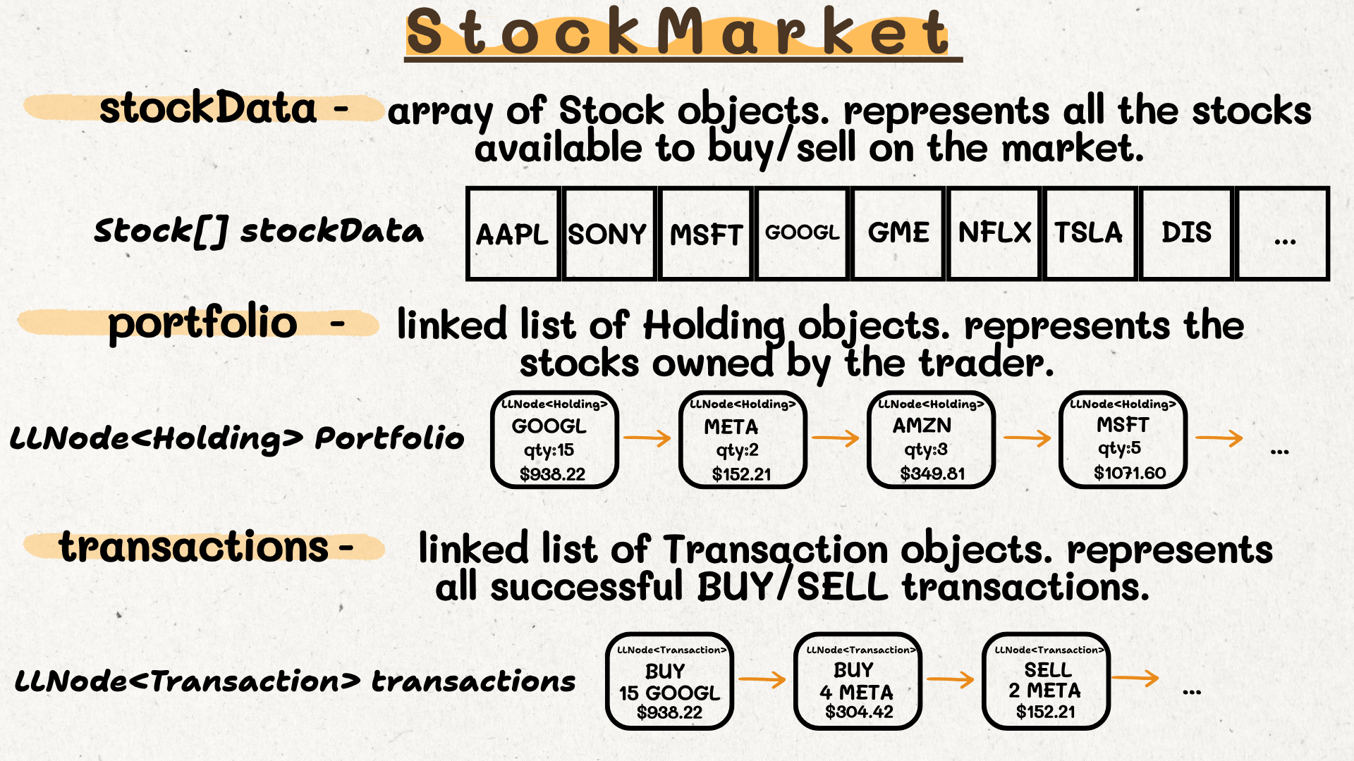 StockMarket.java is where you will code your simulation. There are three data structures you will implement: the stockData array, the portfolio list, and the transactions list.