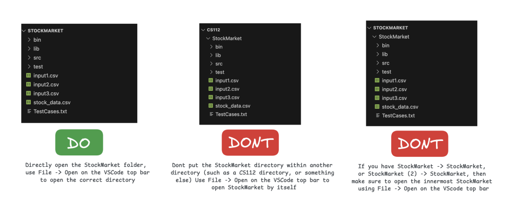 Afterward, open the StockMarket folder in VS Code using File -> Open Folder. Open the StockMarket folder that directly contains the bin, src, and lib folders. If you have a StockMarket folder inside StockMarket, or you have CS112 Code -> StockMarket, you must open the innermost StockMarket folder.