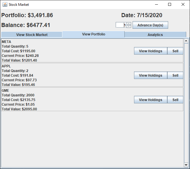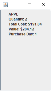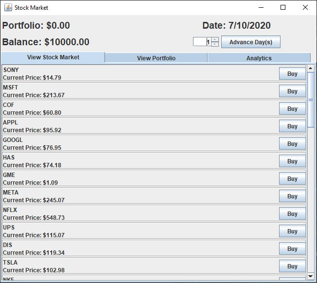 This assignment will simulate a small stock exchange, where stocks are sold and bought between investors. Your job is to create and maintain an array of Stock data, then process and record BUY/SELL transactions. Once implemented, the included Driver will allow you to play this simulation by buying and selling stocks each day in order to maximize your profit.