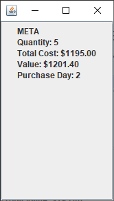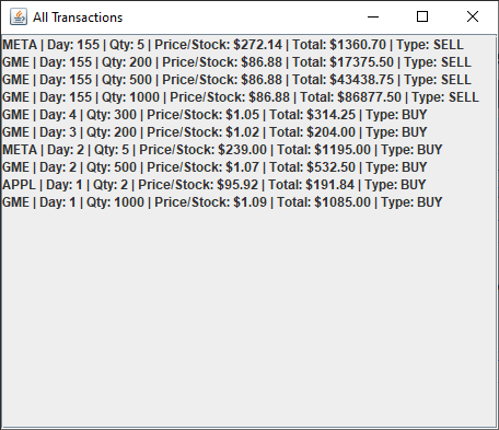 Transaction.java stores information regarding a single buy or sell transaction the investor makes on the market. It stores info about the transaction type, date, stock, quantity, price, and total cost.