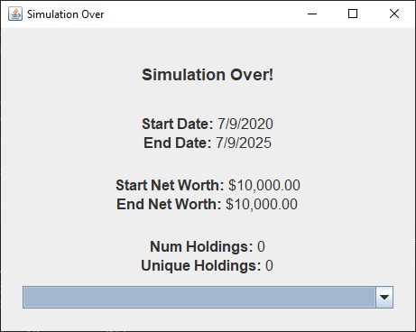 - If the method is functioning properly, the simulation should end on 7/9/2025, and will show an end game screen.