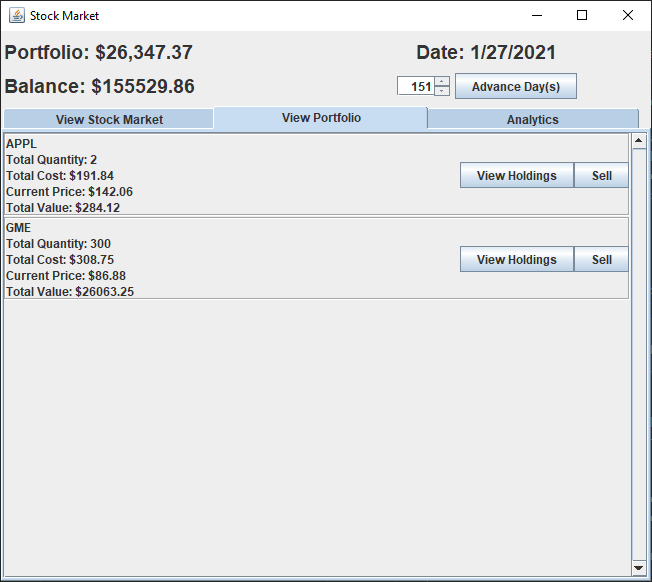 - Then, after advancing to Day 155 and selling two holdings (click View Portfolio to see the sell button) — you can type 151 in the box next to Advance Day(s) then click the button to speed this up: