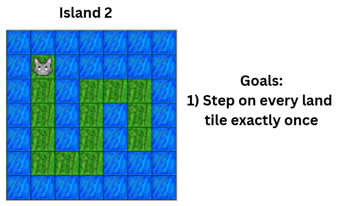 Island 3 is a 7×7 island, which consists of a path of land tiles, surrounded by water tiles. The island contains NO pieces of yarn. Same as solveIsland1(), you are given a Cat via the method parameters which you will control. This cat will spawn at (row 1, col 1). Your goal is to make the cat step on every land tile exactly once, aka traverse to the end of the path (row 4, col 5).
