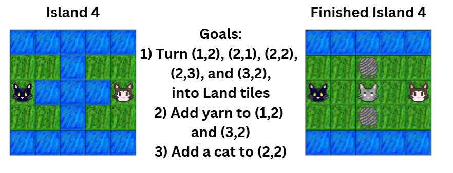 Island 4 is a 5×5 island, which consists of two masses land tiles, seperated from each other by water tiles. Each landmass has a cat on it, and the island contains no pieces of yarn. Your goal is to modify this island, by adding land, yarn, and a cat. In solveIsland4(), you are not given either cats as method parameters. Instead, are given the Island object itself. Your goal is to modify this island object to change the island. To modify the island, you must modify its tiles. The Tiles for an island are stored in a 2D array of tiles, which you can get with island.getTiles(). You can then access any index as a 2D array. i.e. Tile[][] tiles = island4.getTiles(); THEN tiles[0][0].hasYarn = false; // Note: Just a random example To modify a tile type, set its .type attribute to either Tile.LAND or Tile.WATER (which are both static variables in the Tile class). To add yarn to a LAND tile, you can set the hasYarn attribute to true for that tile. To add a cat, you simply call the Cat constructor, and pass in the island and desired row/col coordinates. The cat will place itself onto the island object, you don’t have to. Note: you’ll need to fill out all parameters when you use the Cat constructor. The cat’s name doesn’t matter. And colors must match those declared in Color.java — scroll to the “Special Classes” section above for more info.