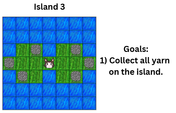Island 3 is a 7×7 island, which consists of a bowtie shape of land tiles in the center, surrounded by water tiles. The island contains 6 pieces of yarn. Same as solveIsland1(), you are given a Cat via the method parameters which you will control. This cat will spawn at (row 3, col 3). Your goal is to make the cat collect all the yarn on the island. You can take any route to do so. Remember, to collect yarn, simply make the cat step onto that tile.