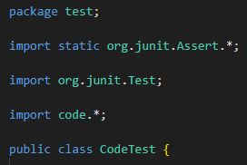 In addition, a test package is provided, with CodeTest.java. This is the unit testing file you will write your code in and submit.