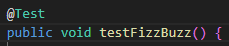 To create a JUnit test, you simply define a method starting with the word “test”, and usually followed by a method or feature name you want to test. You should annotate it as a test method, by placing “@Test” right above the method declaration. For example, the FizzBuzz class has a fizzBuzz(int n) method you will test, so the test in CodeTest.java is defined as: