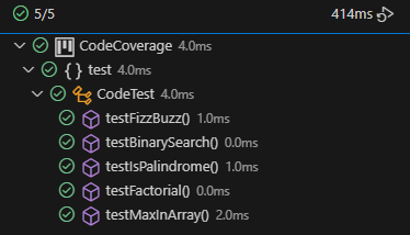 To Run: Open the project directory in VSCode, and click the Run Button in the CodeTest class to run your tests. Make sure you are in the correct directory, you should open the CodeCoverage folder which directly contains the src, and lib folders.
