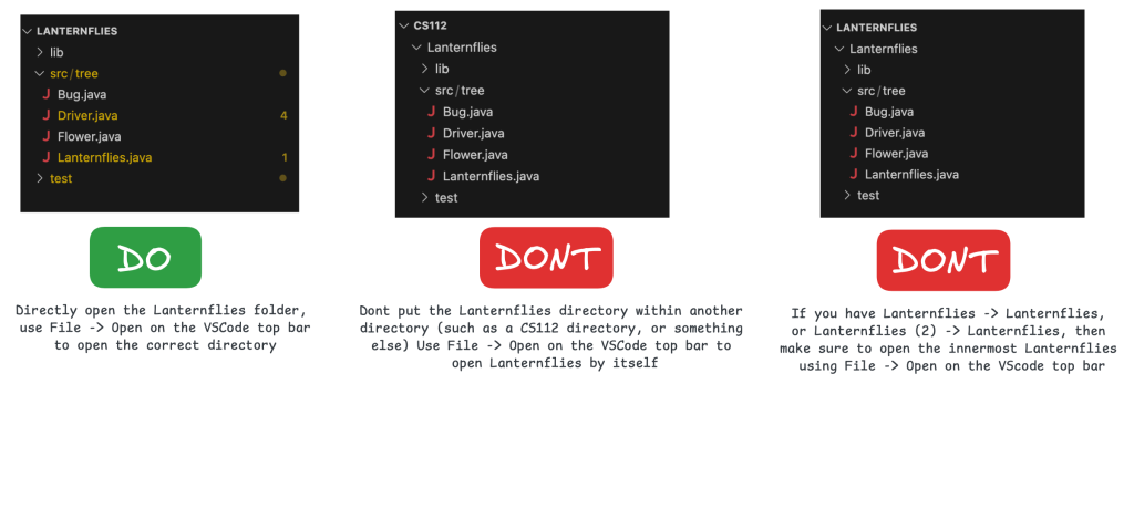 Afterward, open the Lanternflies folder in VS Code using File -> Open Folder. Open the Lanternflies folder that directly contains the bin, src, and lib folders. If you have a Lanternflies folder inside Lanternflies, or you have CS112 Code -> Lanternflies, you must open the innermost Lanternflies folder.