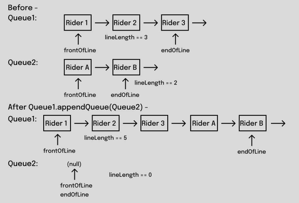 In this method you will be working with ThemeParkQueue objects as a whole. We want to add all the riders in line from “otherQueue” into the end of the line in this queue, in the same order. We can do this in O(1) time by relinking the nodes and updating our frontOfLine/endOfLine references. Remember to update the lineLength attribute. Remember to take care of any edge cases that may arise for this method.